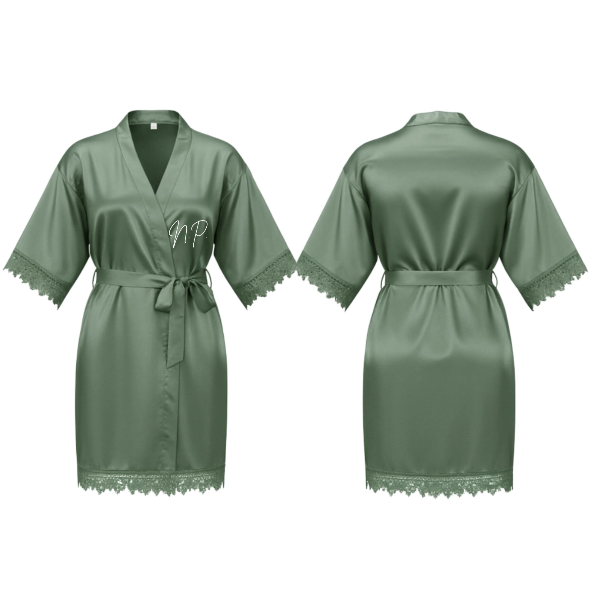 Delicately finished with lace-trimmed sleeves and hem, the flattering knee-length design is complemented by an adjustable waist tie closure for a graceful, tailored fit. Ideal for bridal showers, wedding mornings, and getting-ready photos, this robe can be customized with printed initials for a personalized touch.
