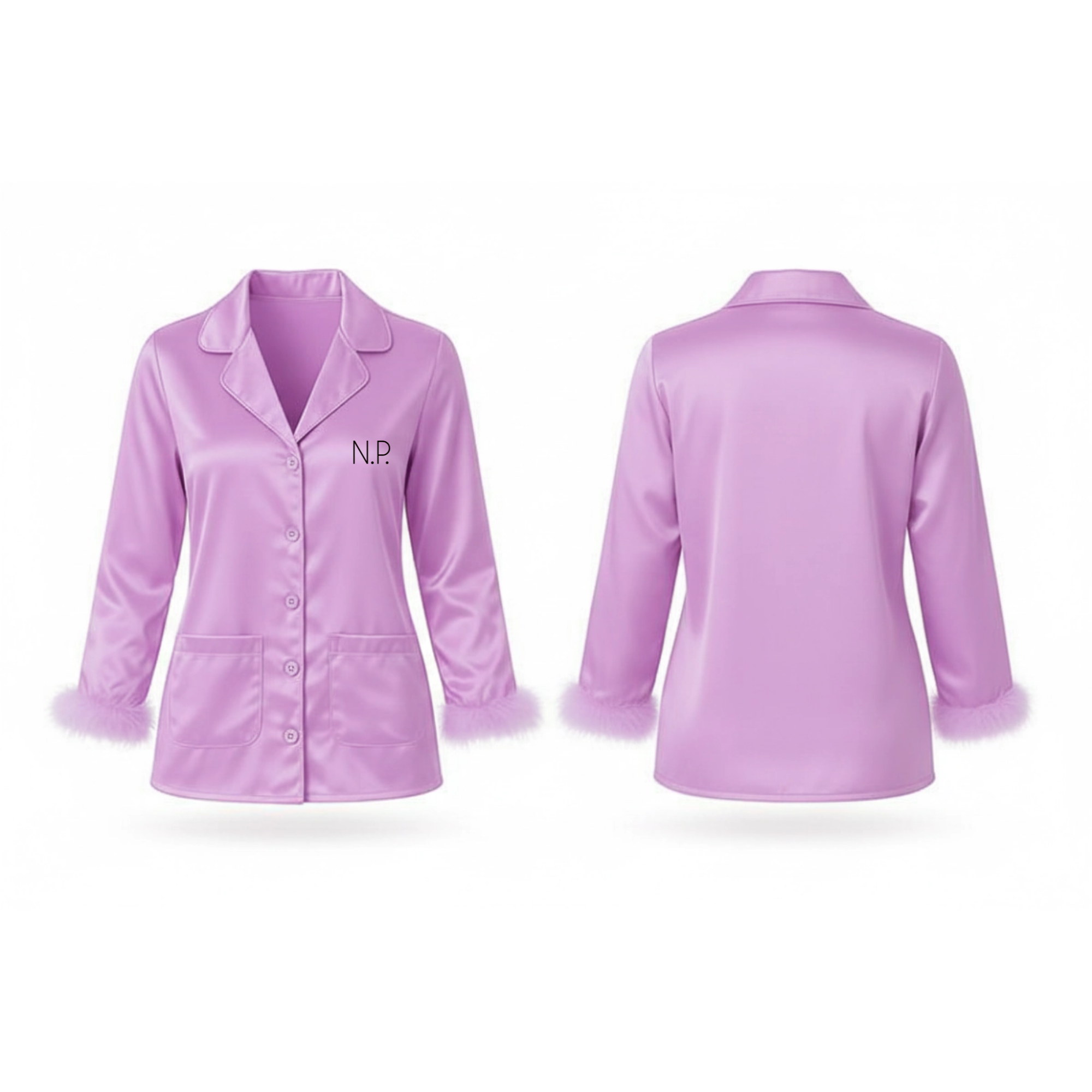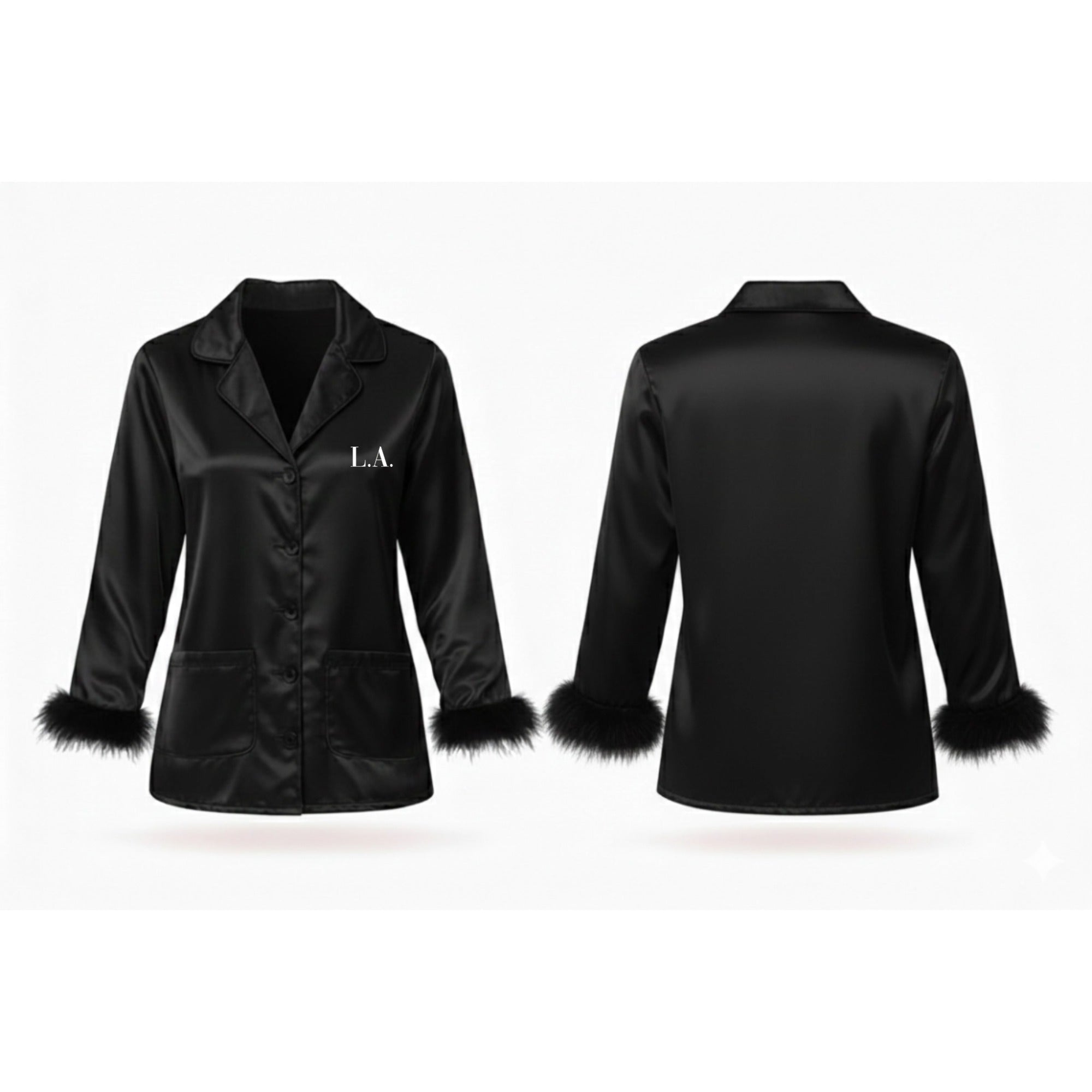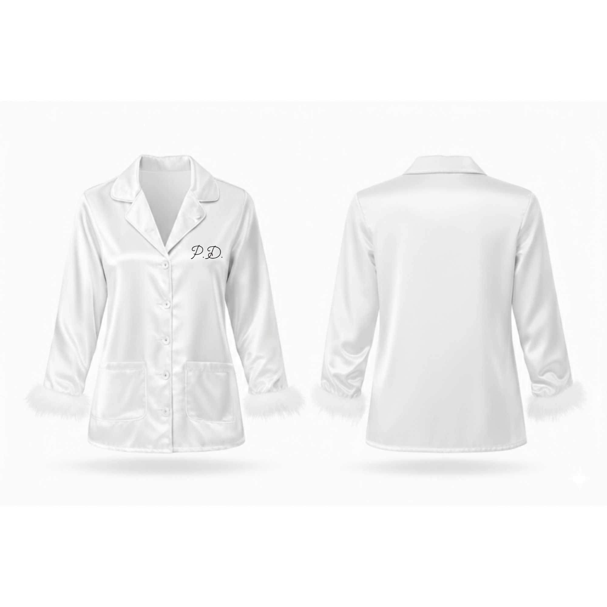 This satin pajama set is designed with a softly structured silhouette and subtle feather trim at the cuffs. Finished with a two-letter embroidered monogram, it’s created to feel refined, effortless, and quietly personal—perfect for evenings in or elevated lounging.