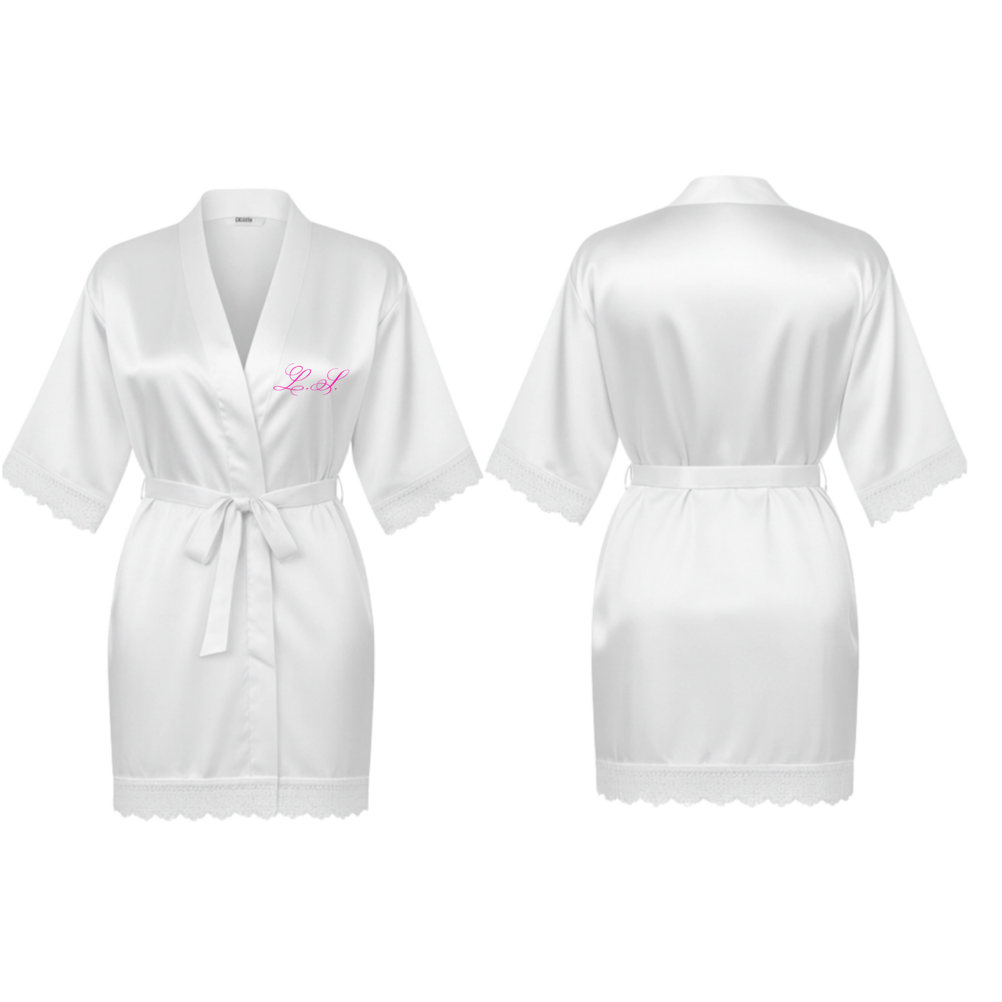 This lace trim satin robe features a smooth, fluid silhouette with delicate lace detailing along the sleeves and hem. Finished with custom embroidered initials on the chest, it’s designed to feel refined, intimate, and effortlessly elegant—perfect for slow mornings, bridal moments, or elevated evenings at home.