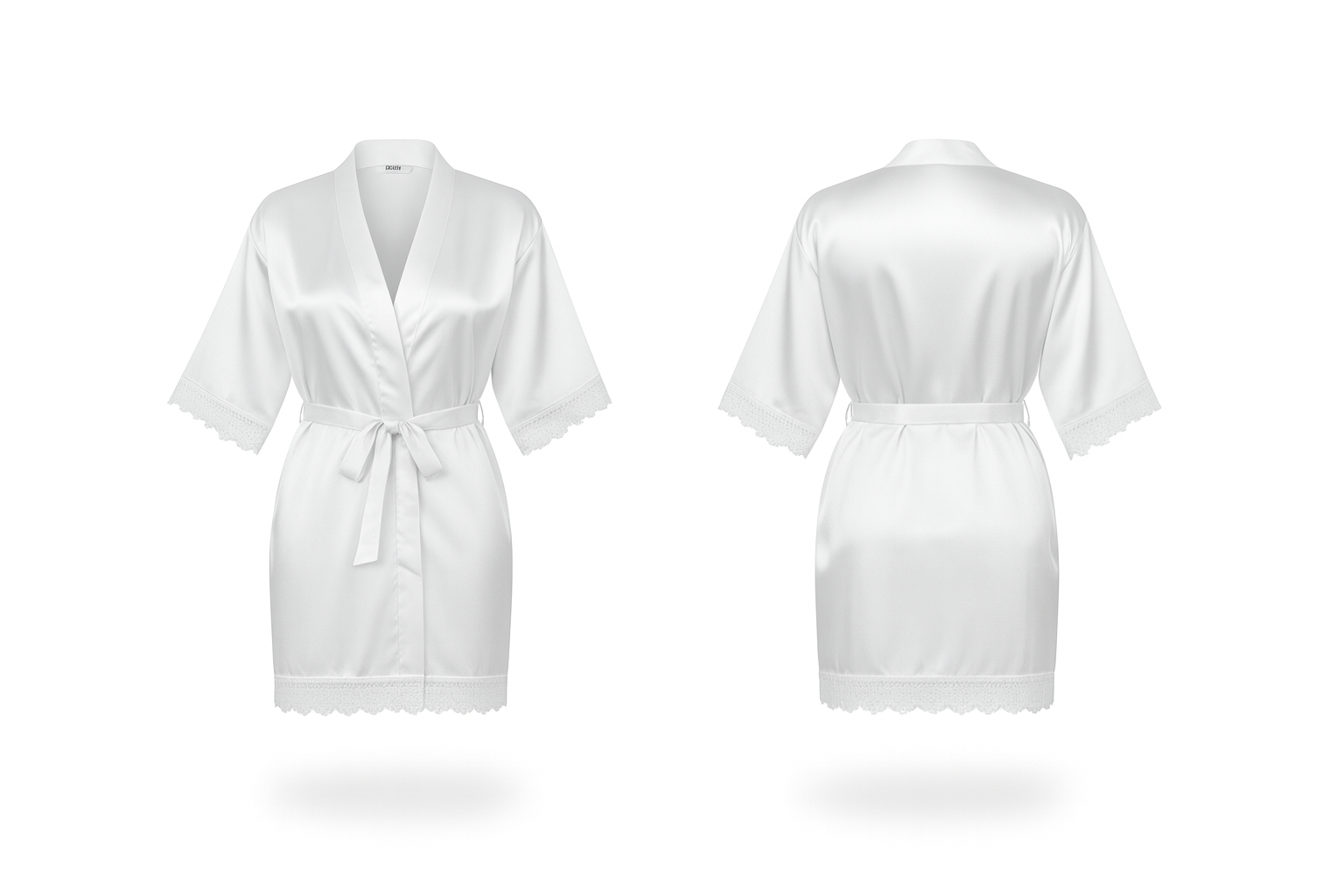 This elegant satin bridal white robe is crafted from 100% polyester for a smooth, breathable feel. Designed with lace-trimmed sleeves and hem, it features a flattering knee-length fit and waist tie closure.