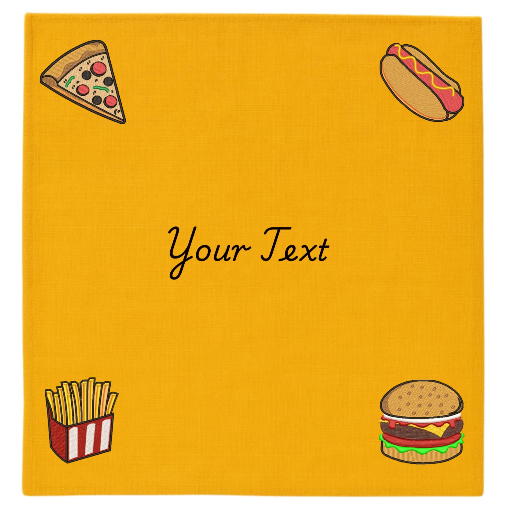 Design: Four embroidered icons (one in each corner) + central embroidered text
