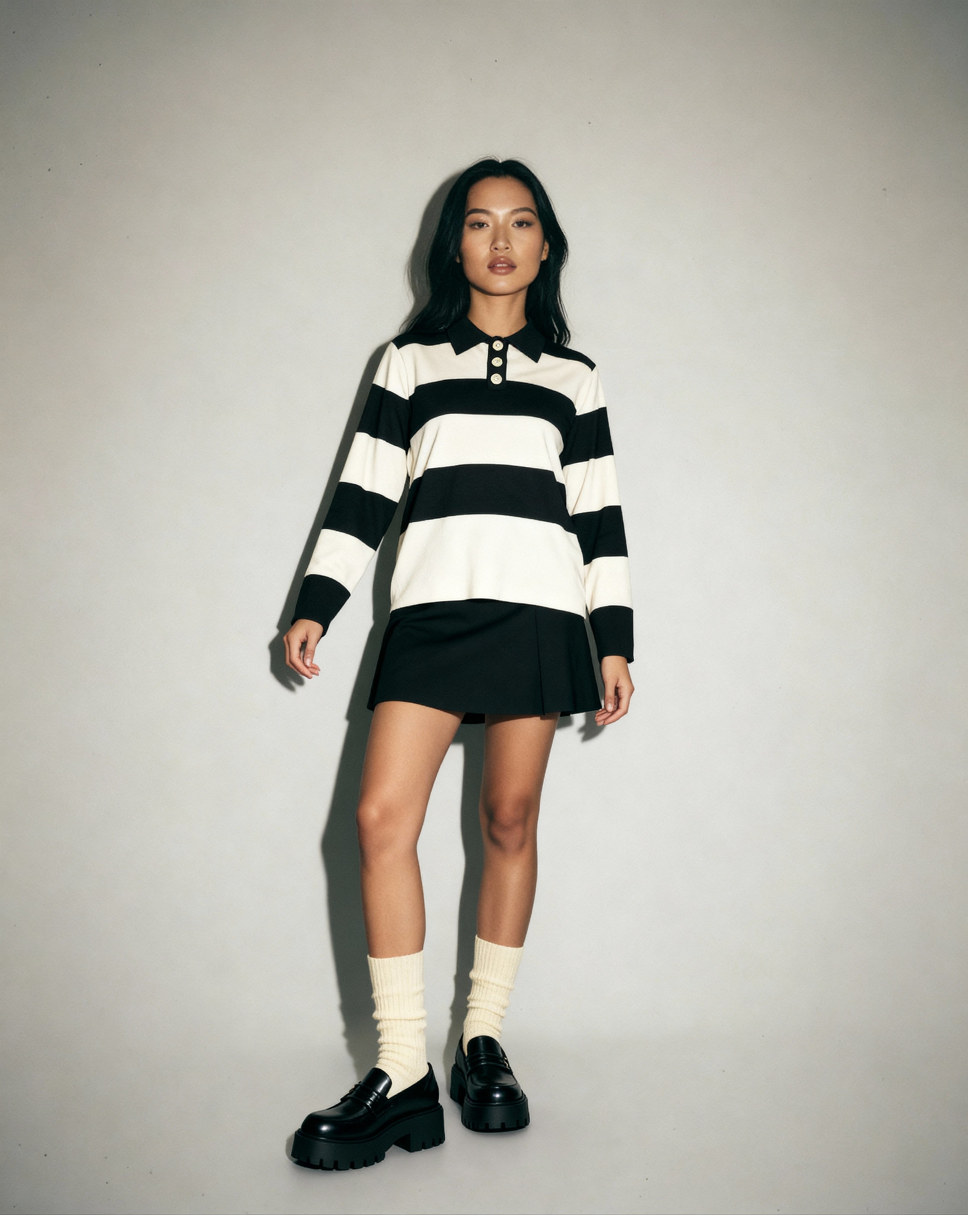 This striped ribbed knit rugby sweater blends sporty style with cozy comfort. Made from a soft viscose-blend fabric, it features bold black and cream stripes, a collared neckline, and a relaxed fit.